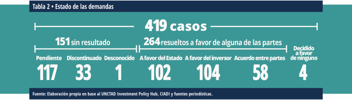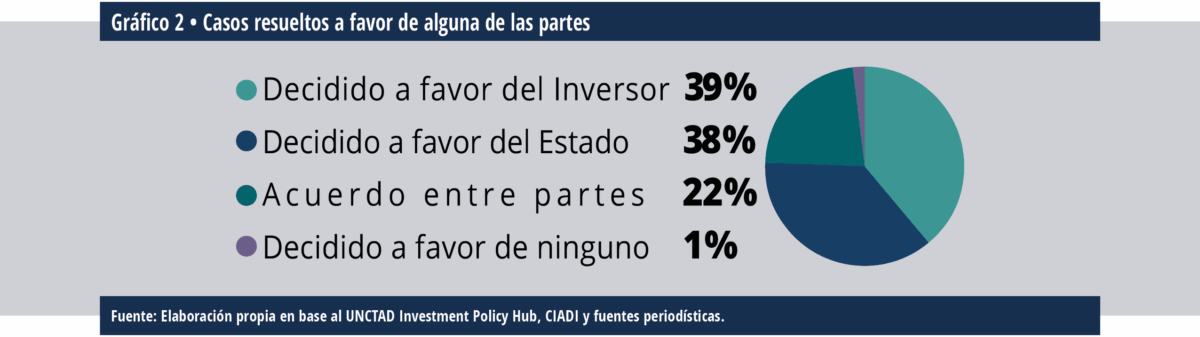 En el arbitraje de inversiones, los Estados han sido los grandes perdedores. De las 419 demandas conocidas contra países de ALC, en 268 ocasiones existió una resolución del caso (ya sea por laudos del tribunal o por acuerdo entre partes). De las 268 demandas resueltas, el inversor salió beneficiado en casi dos tercios de los casos.