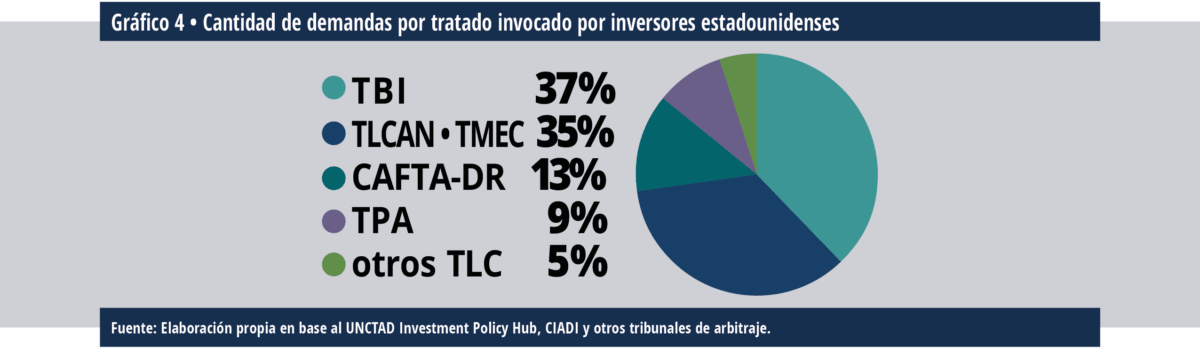 Teniendo en cuenta que inversores de Estados Unidos son quienes han iniciado la mayor cantidad de demandas, no sorprende que los TBI de este país -junto con los tratados comerciales TLCAN (Tratado de Libre Comercio de América del Norte), incluso en su versión actualizada conocida como T-MEC (Tratado México-Estados Unidos-Canadá) y CAFTA-DR (Tratado de Libre Comercio entre Centroamérica, Estados Unidos y la República Dominicana)- sean los más usados.