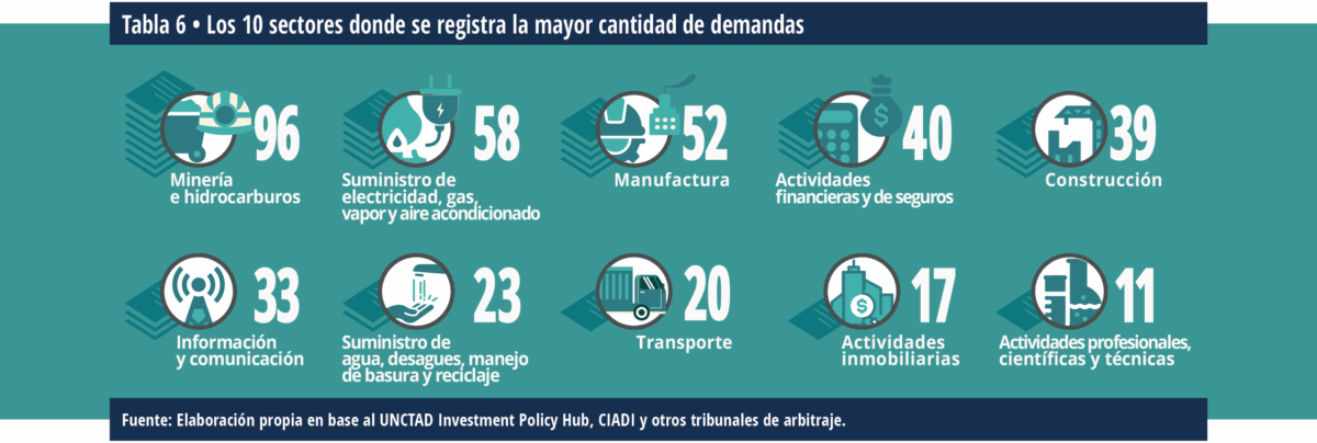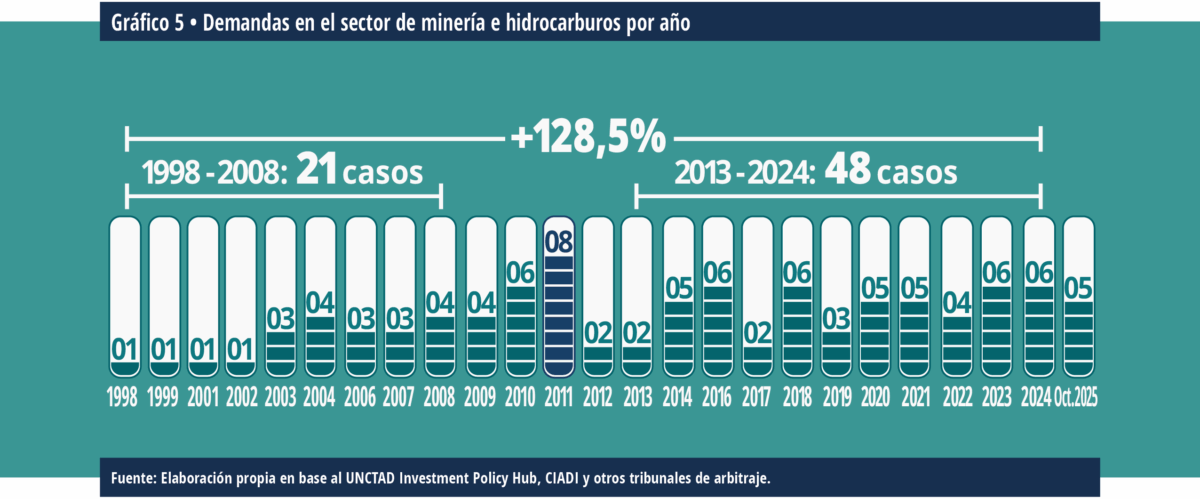 De los 419 casos conocidos contra los países latinoamericanos y caribeños, 96 se relacionan con los sectores de minería, y extracción de gas y petróleo18, lo que representa un 23% de las demandas. Si comparamos el período 1998-2008 –en el cual los países de ALC recibieron 21 demandas en estos sectores– con 2014-2024, cuando se recibieron 48 demandas, notamos un incremento del 128,5%.