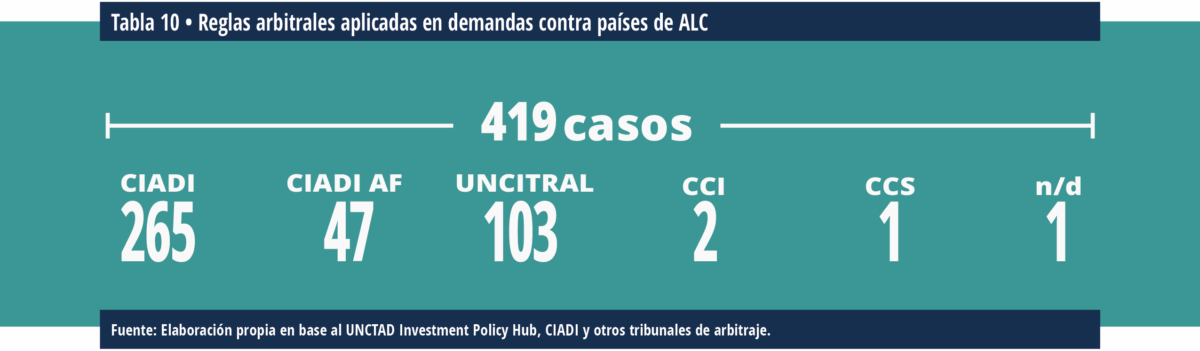 Además de seleccionar el foro arbitral, los inversores tienen el derecho de elegir las reglas arbitrales que guiarán el caso. En los casos contra ALC, los inversores han elegido las reglas del CIADI en 265 de las 419 demandas en la región. Si sumamos el mecanismo complementario del CIADI (CIADI AF), que fue utilizado 47 veces, se puede afirmar que en tres cuartos de las demandas contra países latinoamericanos se recurrió a las reglas del CIADI para resolver