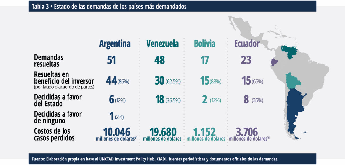 Un desequilibrio importante a favor del inversor también puede observarse en el caso de Venezuela, el país más demandado de la región. Solo 18 de las 41 demandas con laudo fueron decididas a favor del Estado, mientras que 23 casos se decidieron a favor del inversor. Si a estos 23 casos sumamos los 7 que terminaron en acuerdo, se concluye que el 62,5% de las demandas concluidas contra Venezuela tuvieron un resultado favorable para el inversor. Situaciones similares, favorables al inversor, se dan en los casos contra Bolivia y Ecuador.
