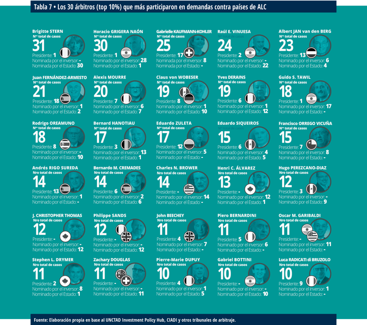 Si bien hay un total de 298 árbitros que han formado parte de tribunales contra países de ALC, la gran mayoría solo ha participado en unos pocos casos. Es un grupo reducido de árbitros quienes han sido nominados repetidamente y por tanto concentran el poder de decisión sobre las demandas.