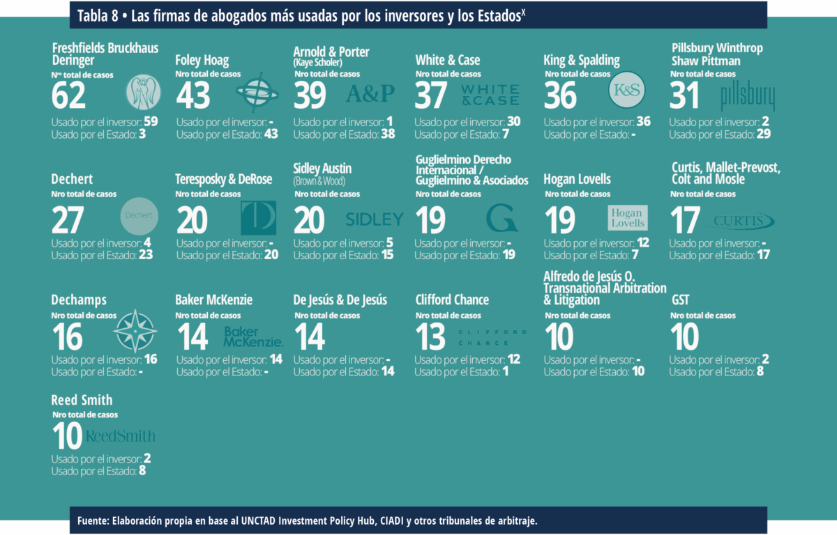 El bufete de abogados más usado por los inversores en casos contra países de ALC es Freshfields (Bruckhaus Deringer) con participación en 62 demandas. Le siguen White & Case con 37 demandas y King & Spalding con 36 demandas. Por su parte, los Estados, salvo una pequeña minoría, también tienden a contratar bufetes de abogados internacionales para su defensa. Los bufetes más contratados por parte del Estado son Foley Hoag (43 casos) –muy utilizado por Venezuela y Ecuador– Arnold & Porter (Kaye Scholer) (39 casos)– a servicio de los países centroamericanos y caribeños, sobre todo Panamá y la República Dominicana – y Pillsbury Winthrop Shaw Pittman (31) que defiende casi exclusivamente a México.