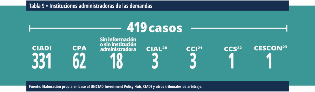 Hay muchos centros de arbitraje donde se pueden resolver diferencias relativas a inversiones. Sin embargo, el centro de arbitraje más concurrido a nivel mundial y en demandas contra ALC es el Centro Internacional de Arreglo de Diferencias Relativas a Inversiones (CIADI) perteneciente al Grupo Banco Mundial. El CIADI fue utilizado 331 veces por los inversores para presentar demandas contra países de la región. Esto significa que el 79% de todas las demandas fueron llevadas a este centro de arbitraje. Argentina es un buen ejemplo en este caso, ya que 61 de sus 65 demandas fueron registradas en el CIADI.