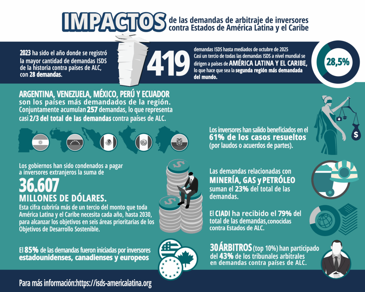 Este informe presenta una sistematización y análisis de las estadísticas de las demandas arbitrales iniciadas por inversores extranjeros contra los Estados de América Latina y el Caribe (ALC) en el marco de tratados internacionales de protección de inversiones. Los datos relevados abarcan hasta el 15 de octubre de 2025. Además se ofrece un análisis de los impactos de estas demandas.